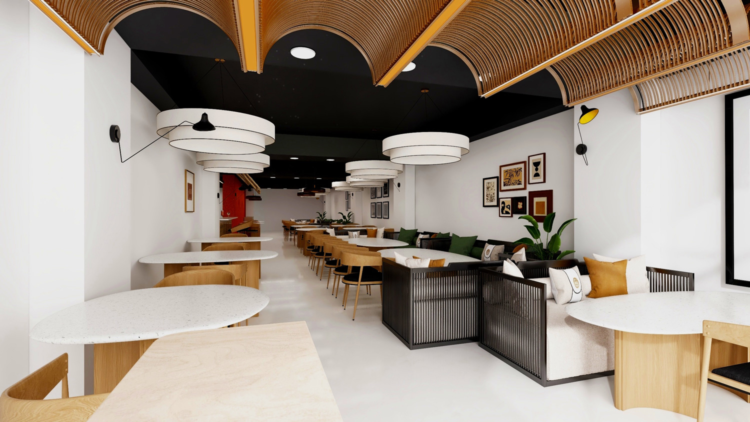 We design restaurant interiors that balance visual storytelling, functionality, and customer experience.